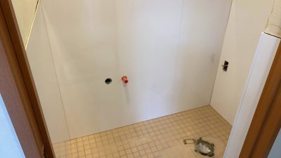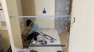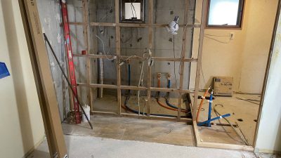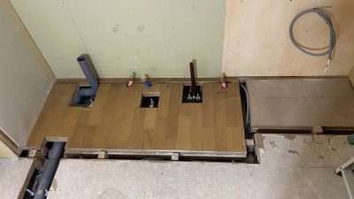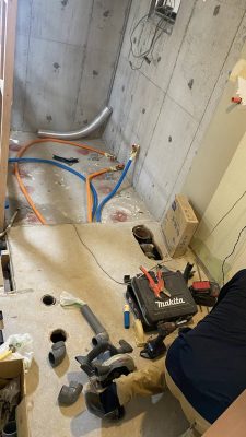 写真にもあるように、床を一部開口して排水・給水・給湯管を新しく敷設しました。